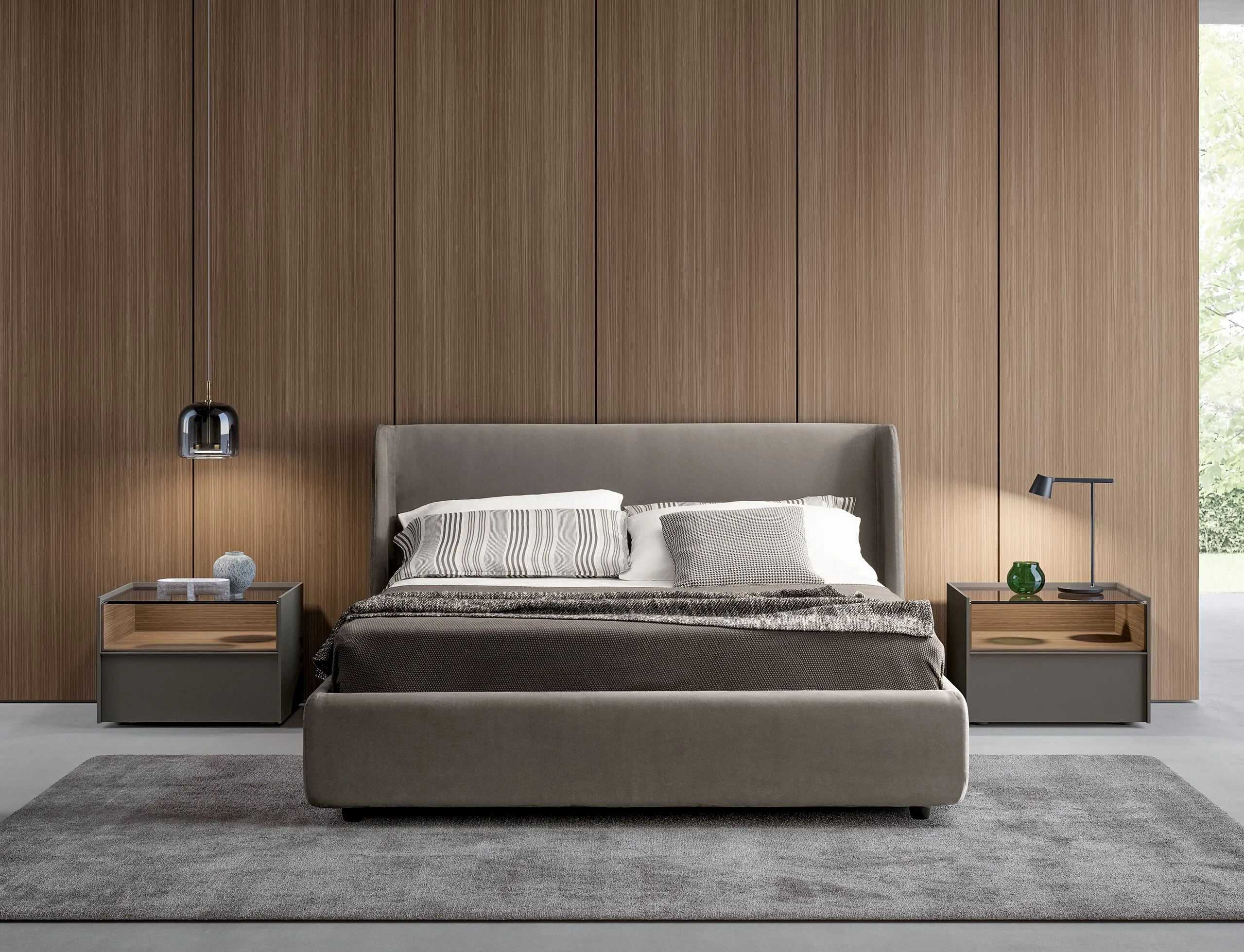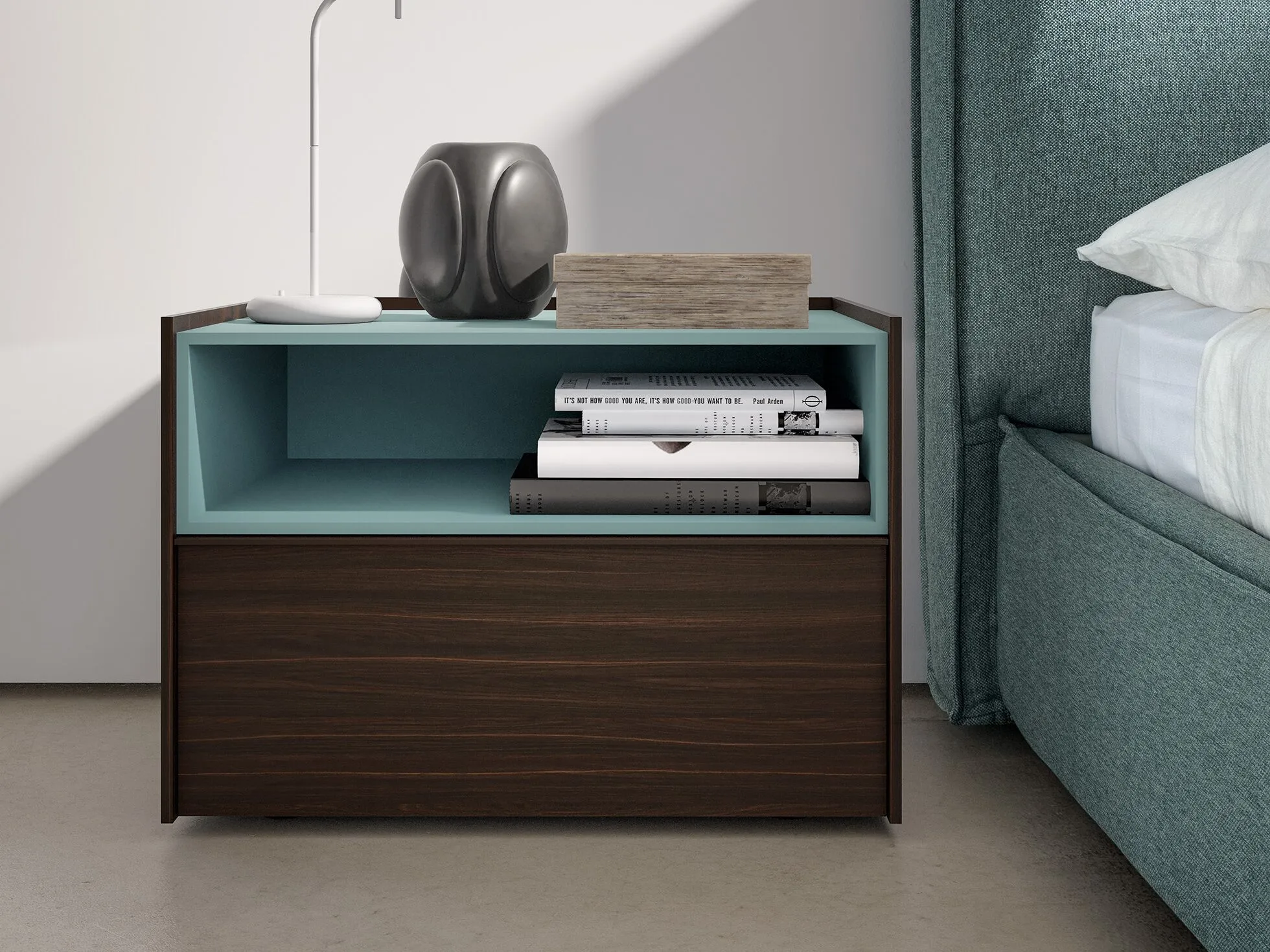 Stream is a bedside table in melamine.‎ A rational design that plays with individual details to provide perfect accessories in a modern bedroom inspired by a linear and minimalist style.‎ The Stream collection consists of a bedside table, a chest of drawers and a tallboy that have a top with a slightly raised edge, designed to create a practical ‘tray’ effect.‎ If you are looking for a more dynamic look, you can choose the same elements, but enriched with splendid open compartments, ideal for creating a play of full and empty spaces that will enhance the entire night area.‎